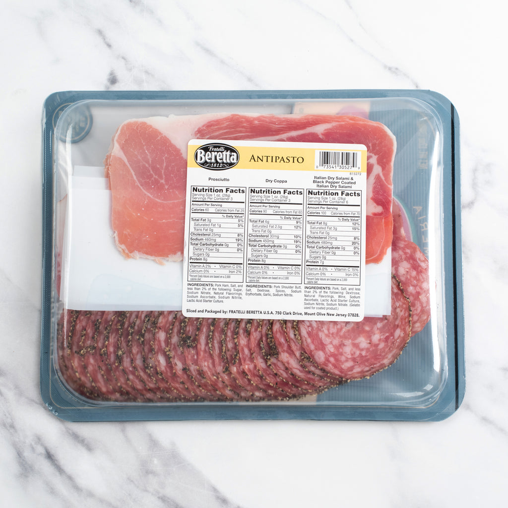 Perfect for parties or unexpected guests! This tray contains 3 ounces each of sliced prosciutto, Italian dry salami, black pepper salami, and coppa ham. With some bread, olives, and a bottle of vino or two, you're all set for an impromptu picnic.