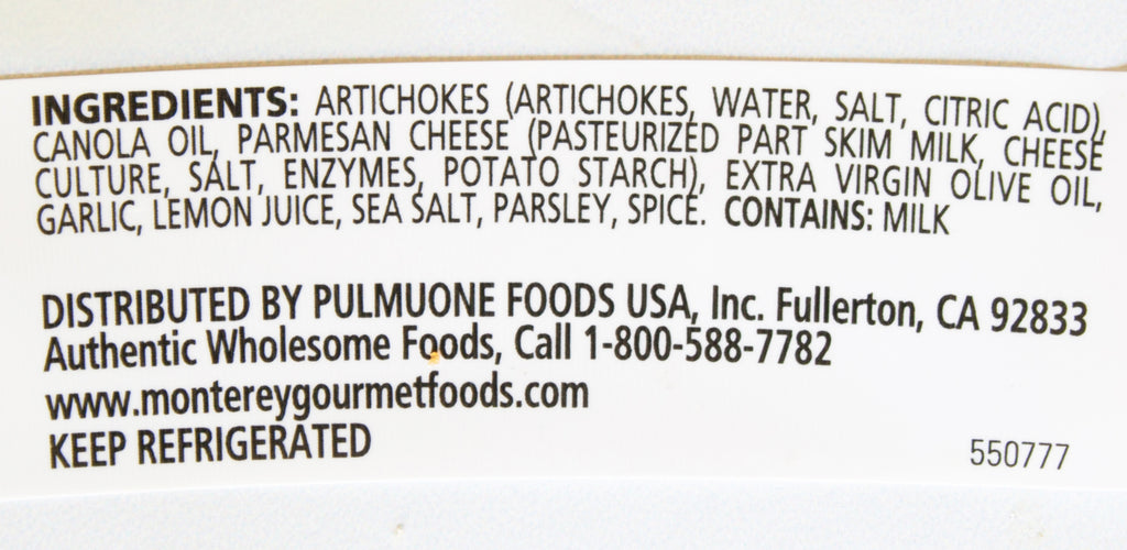 A delicious blend of artichoke hearts and fresh lemon juice with Non-GMO and rBGH-Free Parmesan cheese and fresh garlic. Cibo Naturals manufactures to very high quality standards and their dedication to using only natural ingredients shows through in all they do. Some of their ‘Natural Foods’ standards actually even exceed USDA requirements which only consider "minimally processed" ingredients and the use of "no artificial" ingredients. Artichoke Lemon Pesto can be enjoyed as a spread or to enhance the flavor of your favorite pasta, seafood and poultry dishes.