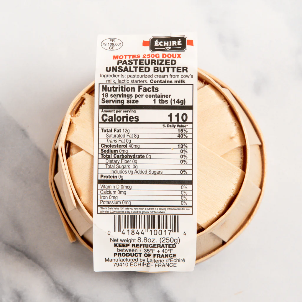 Try a taste of the old world with this sumptuous French butter from Echire. Made in the traditional way in barrel-shaped churns from cream matured for 24 to 36 hours. Their methods allow the development of the prized nutty characteristics the region is famous for. This time-honored tradition creates very pure butter with an incomparable taste and texture. Appelation d'Origine Controlee.