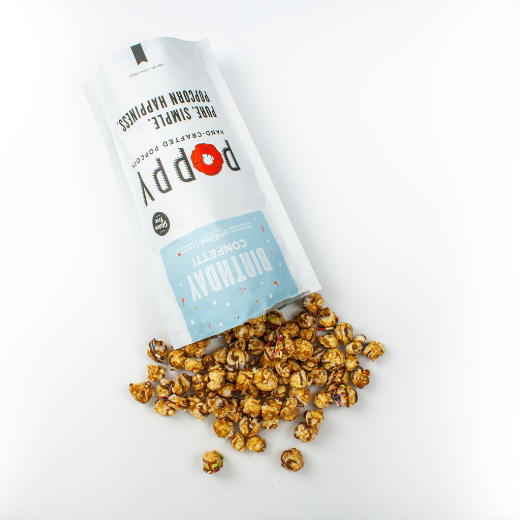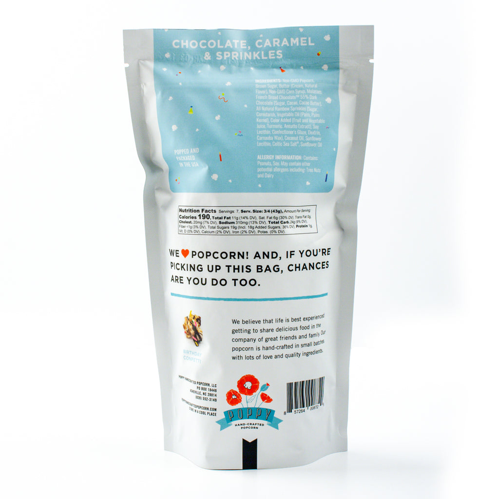 The best gift to give (and to get)! Poppy Handcrafted Popcorn's famous Salted Caramel popcorn drizzled with white and dark craft Chocolate from French Broad Chocolate – and no celebration is complete without sprinkles!