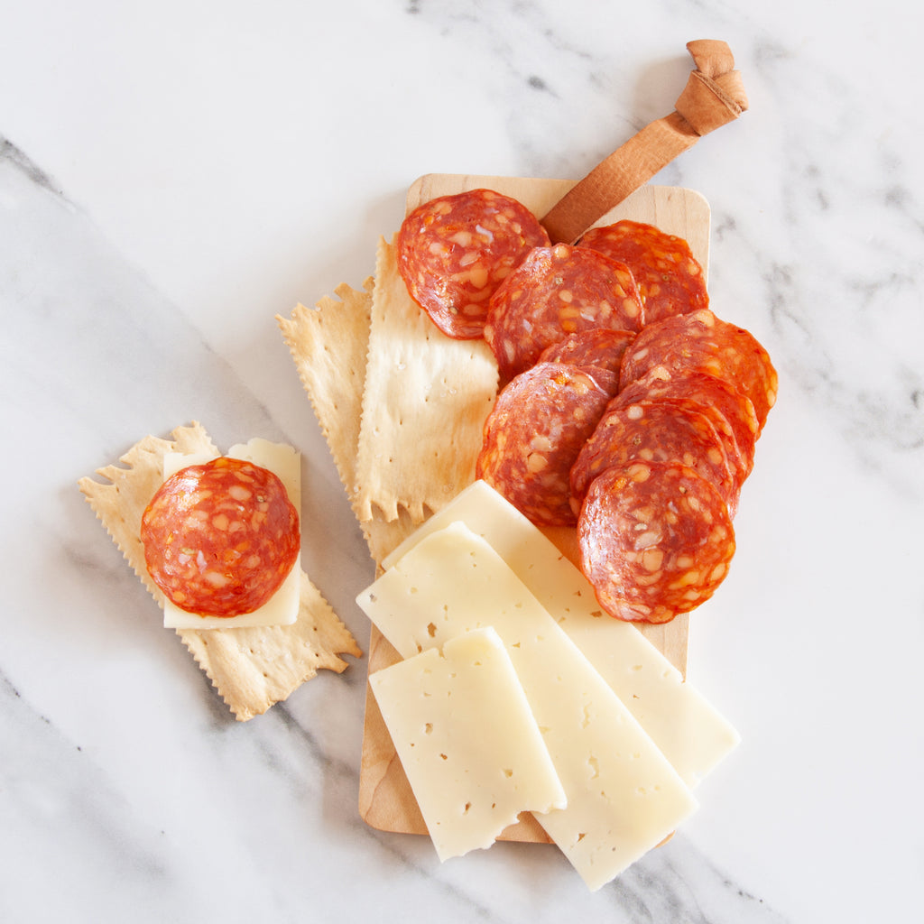 The perfect Italian gourmet snacking experience, ready-to-go: pre-sliced Calabrese salami (spicy Calabrese gets its kick from cayenne pepper & paprika, making it zesty but not overpowering), pre-sliced, all-natural Asiago cheese and crispy artisan crackers.
