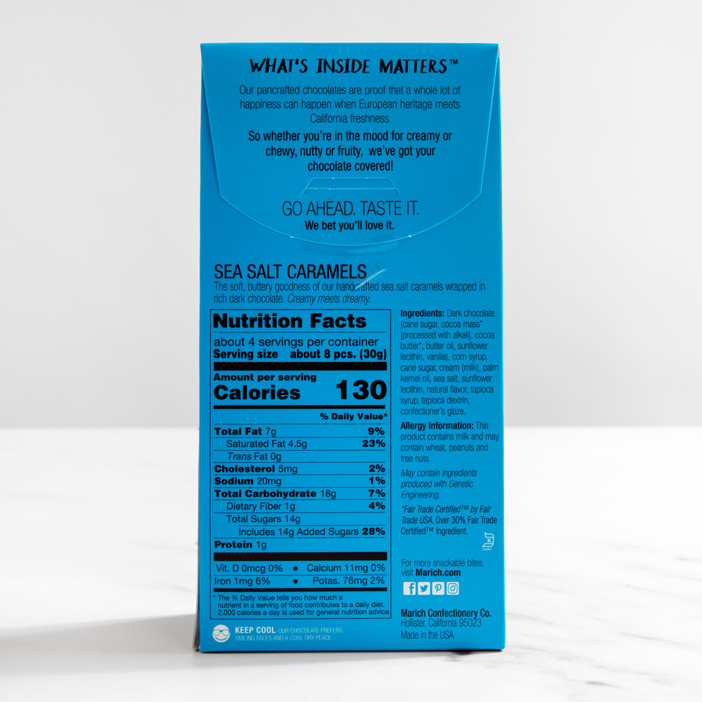 Dark Chocolate Sea Salt Caramels are crafted from pure cane sugar, real AA butter with just a hint of sea salt. Marich's signature gable box is the perfect indulgent gift for any occasion.