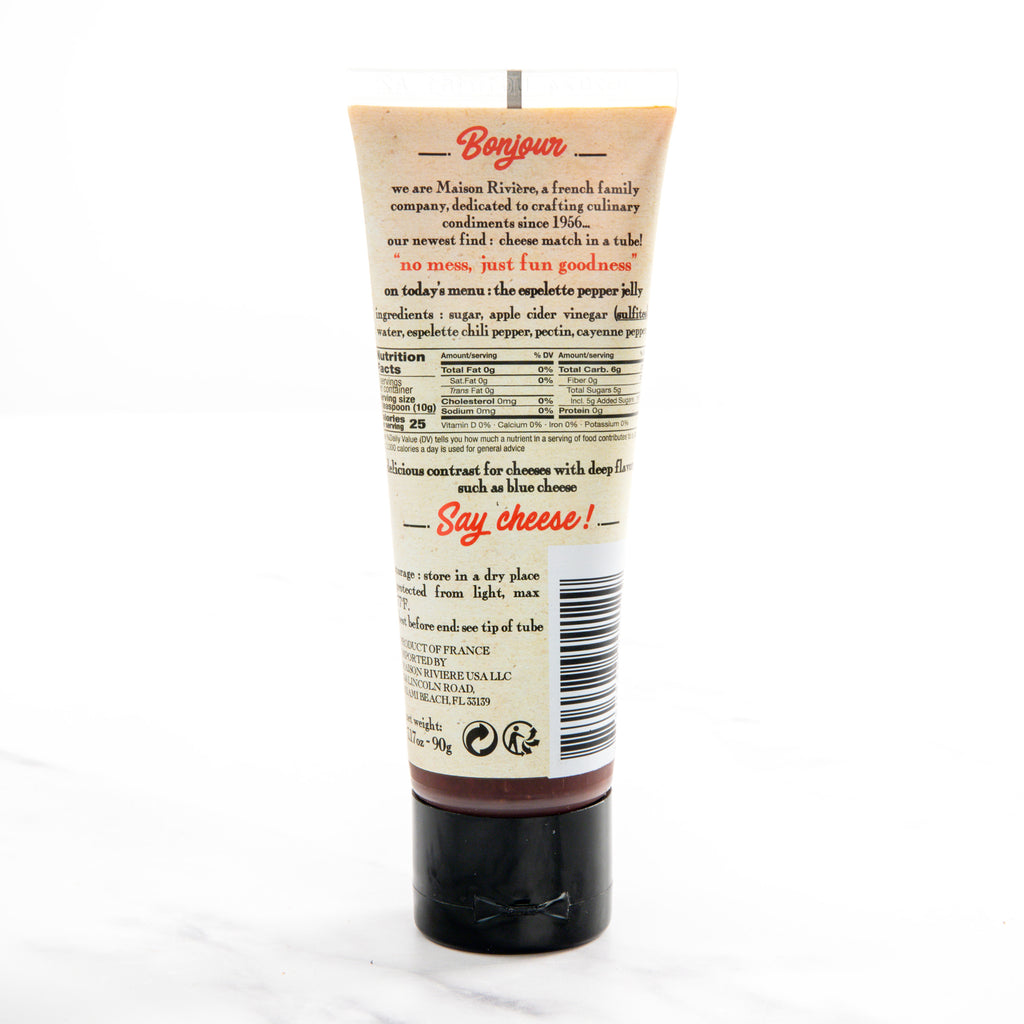 Maison Riviere’s Hot and Sweet Espelette Pepper Jelly is the perfect contrasting complement for strong-flavored cheeses such as blue cheese or sheep milk cheese. Comes in a handy tube for easy storage and perfect no-mess portioning.