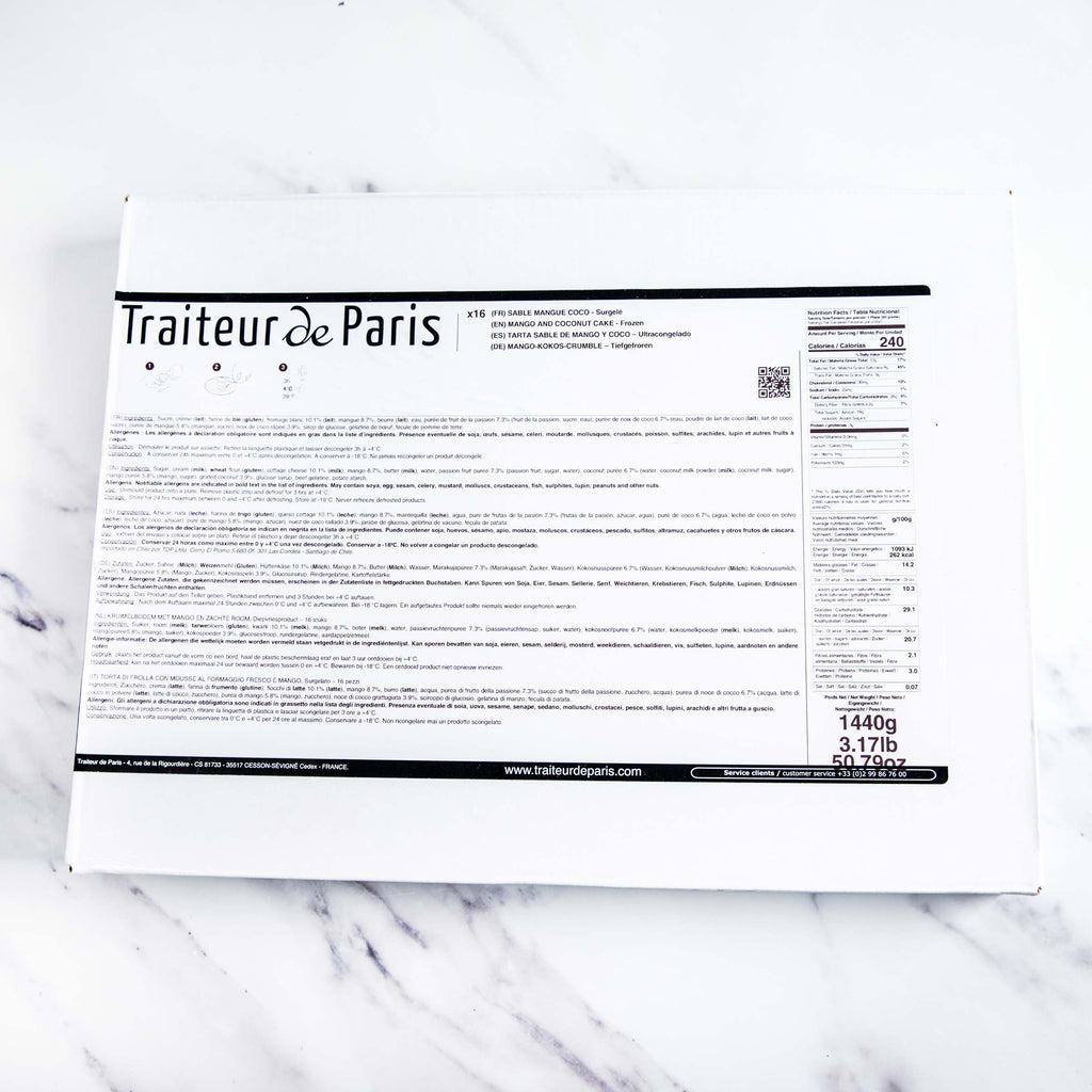 Traiteur de Paris works with professional French pastry chefs, to provide refined sweets to catering professionals. And now, you can have their luxurious frozen delicacies delivered straight to your door! Created in kitchens based in Brittany and Normandy, and crafted from 100% all-natural ingredients, you’ll love this fresh and light Mango and Coconut Cake. Featuring a pure butter shortbread crumble paired with creamy coconut mousse and tropical fruit, it’ll provide a lively and summery finish to a meal—even in the dead of winter.