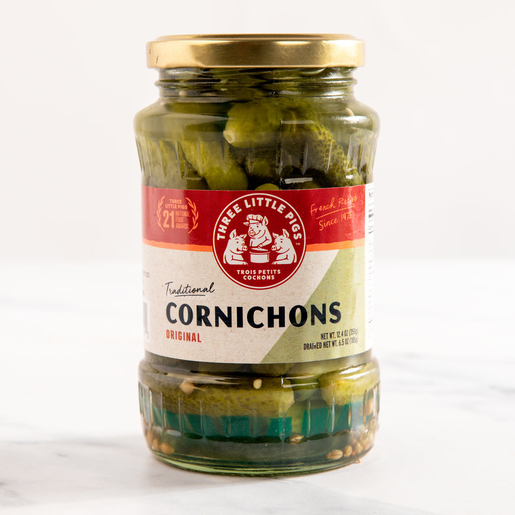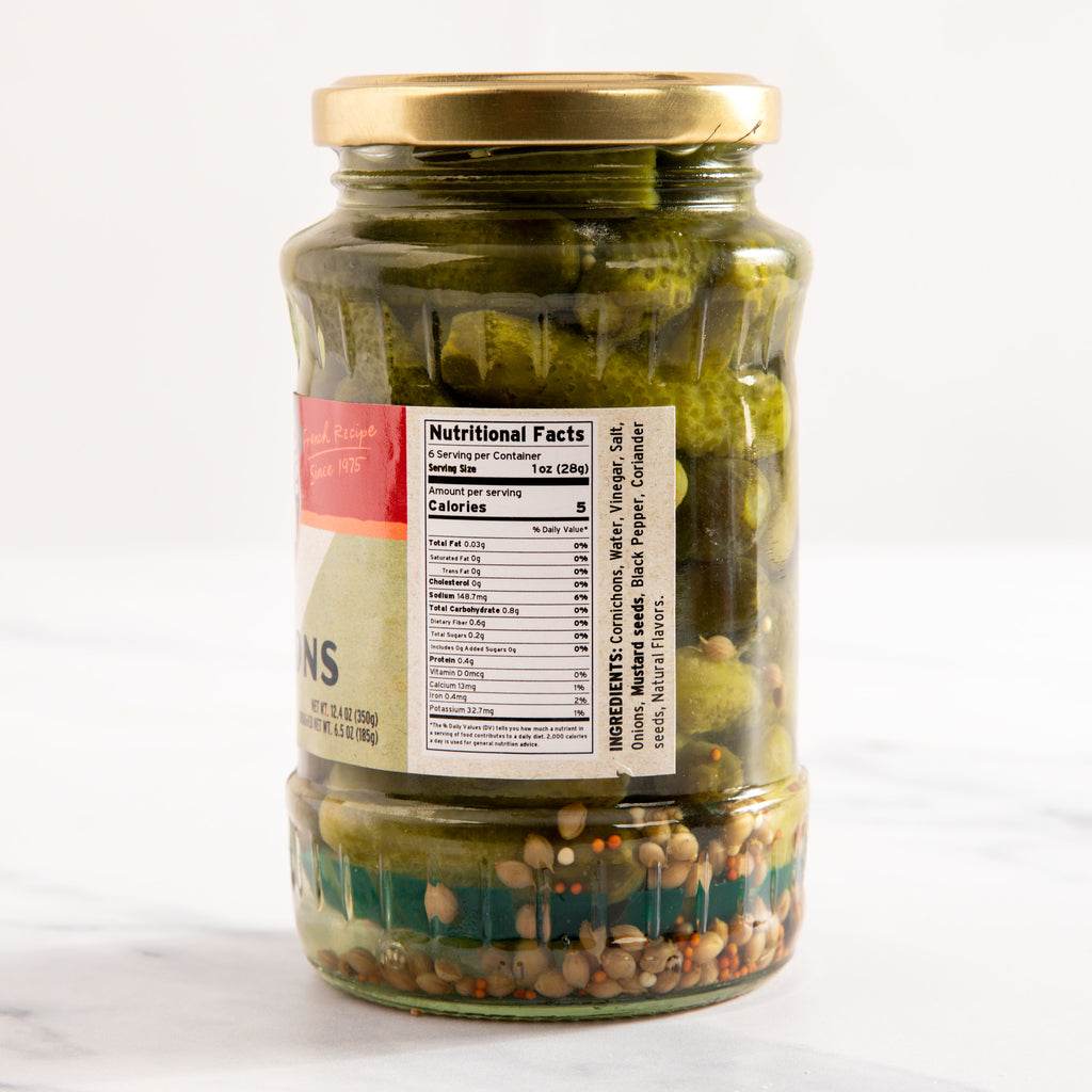 Cornichons: Drenched in a brine of white wine vinegar, salt, pearl onions and select spices, these tangy little pickles are zesty and delicious. (12.35 ounces)