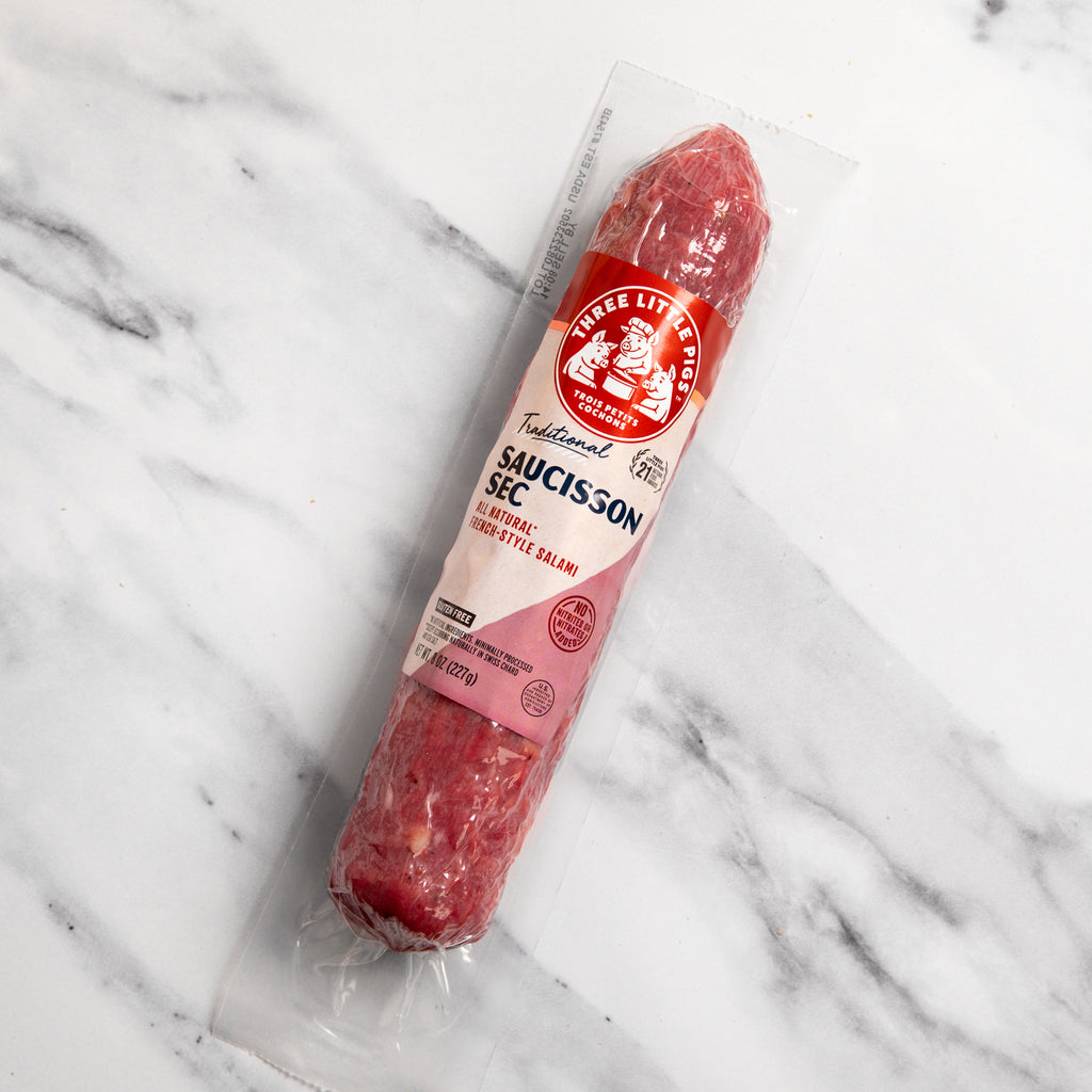 Saucisson Sec: A delicious French style, dry cured salami. Made of coarsely ground pork and studded with whole peppercorns. (8 oz)