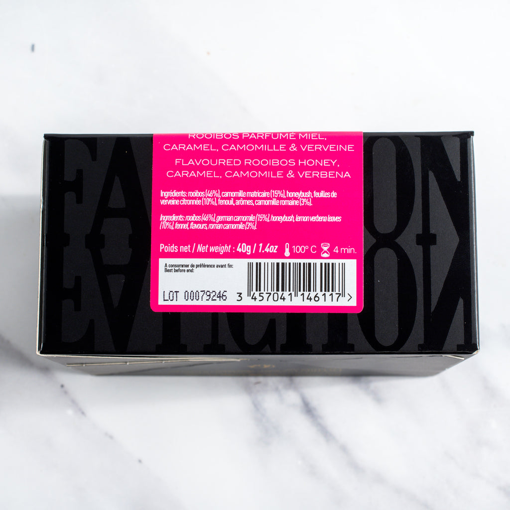 Relaxing chamomile, fennel, verbena add lovely floral, anise and lemon notes. Fauchon rounds out the flavor with the addition of honey bush tea, also from South Africa. Honeybush is closely related to Rooibos, but tends toward sweeter, honeyed notes.