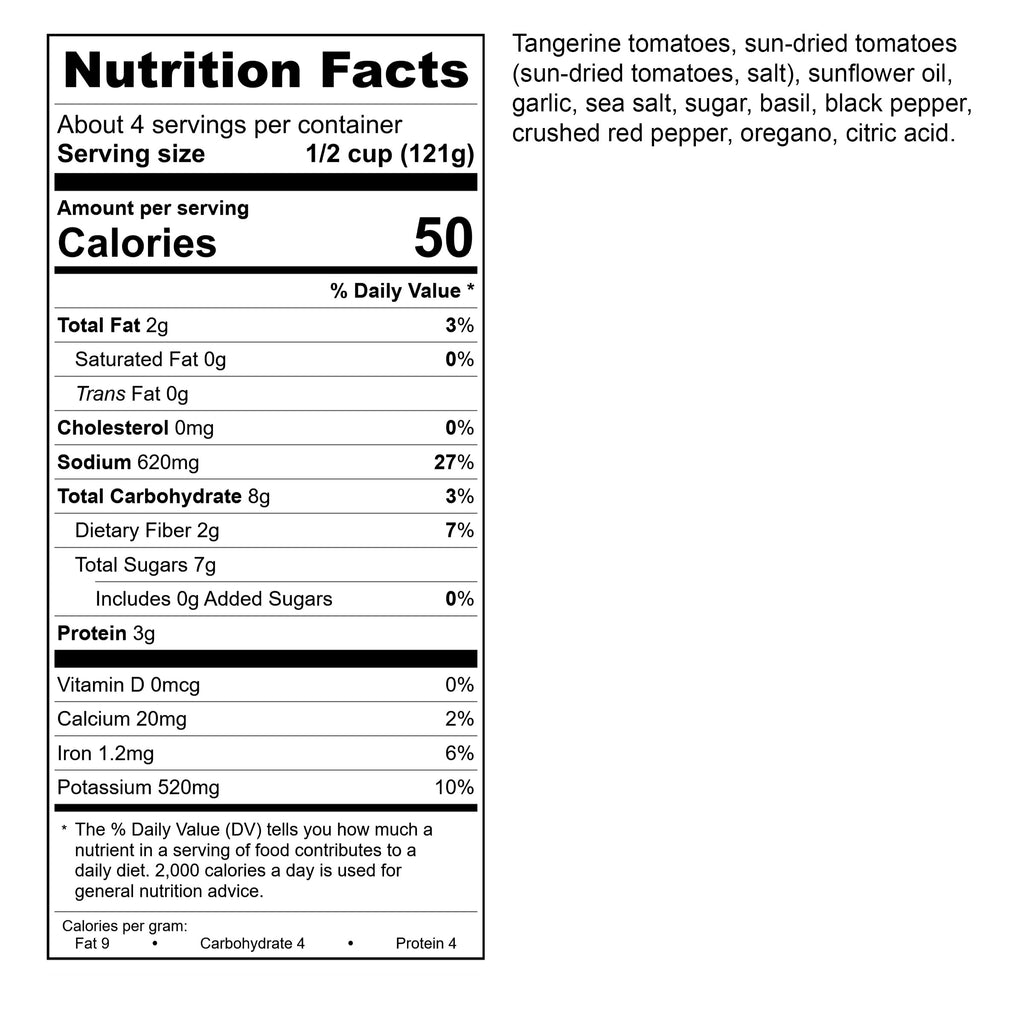Sun-dried Tomato Pasta Sauce with Tangerine Tomatoes: Bursting with flavor this pasta sauce elevates any noodles or homemade pizza into a dining experience. Small batch made with sun-dried tomatoes. Try with fettuccini, lasagna, pizza.