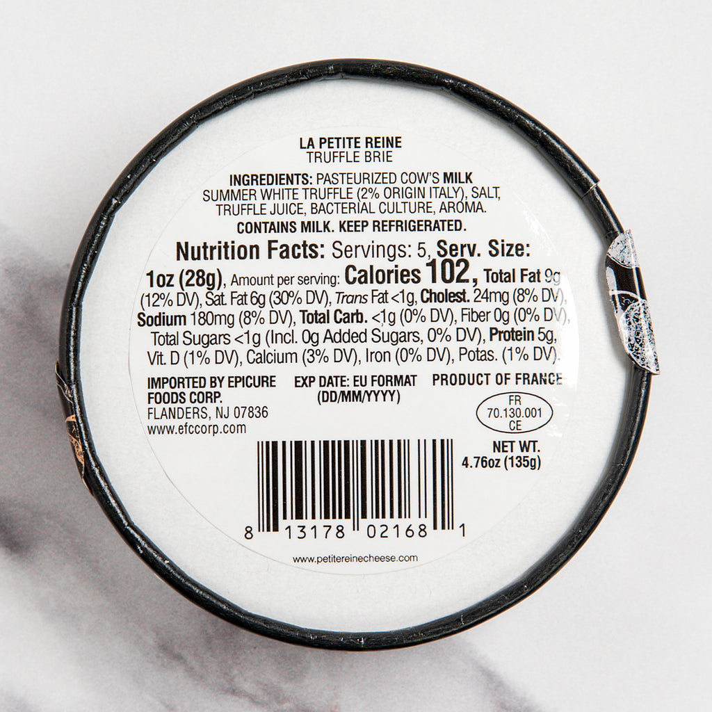 How can a rich, creamy Brie get any better? La Petite Reine has added a layer of Italian truffles to the center of this luxurious cheese. Perfectly balanced, the mushroomy, buttery notes of this baby Brie complement the earthy, umami flavors of black summer truffles. This little gem requires very little - simply bring to room temperature and enjoy with a baguette or a neutral cracker. We love this served with Champagne.